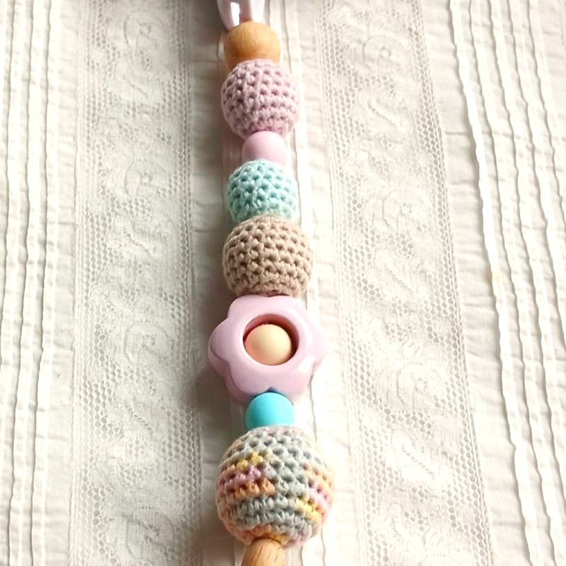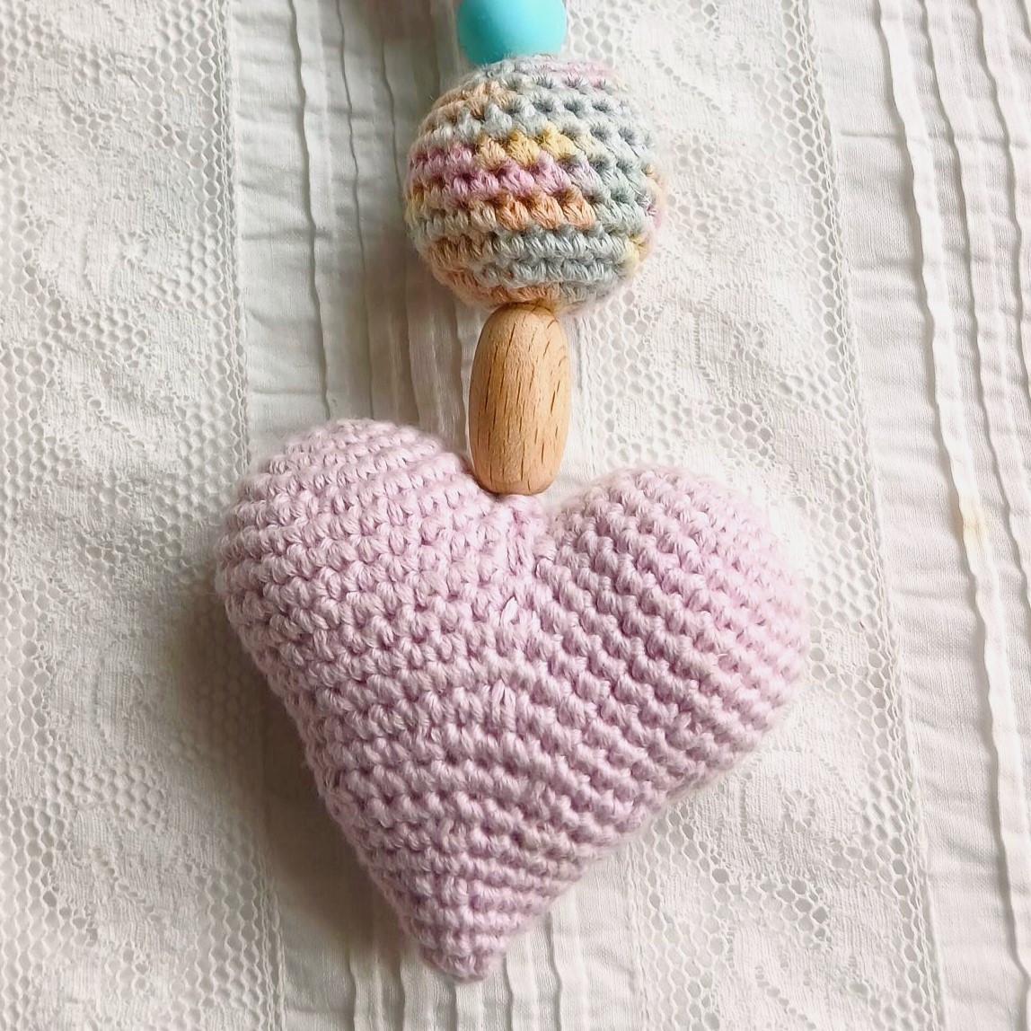 J'ai placé un couineur dans le coeur, un grelot dans la grosse perle crochetée et une petite perle au centre de la fleur en bois, pour amuser bébé et favoriser la motricité fine.