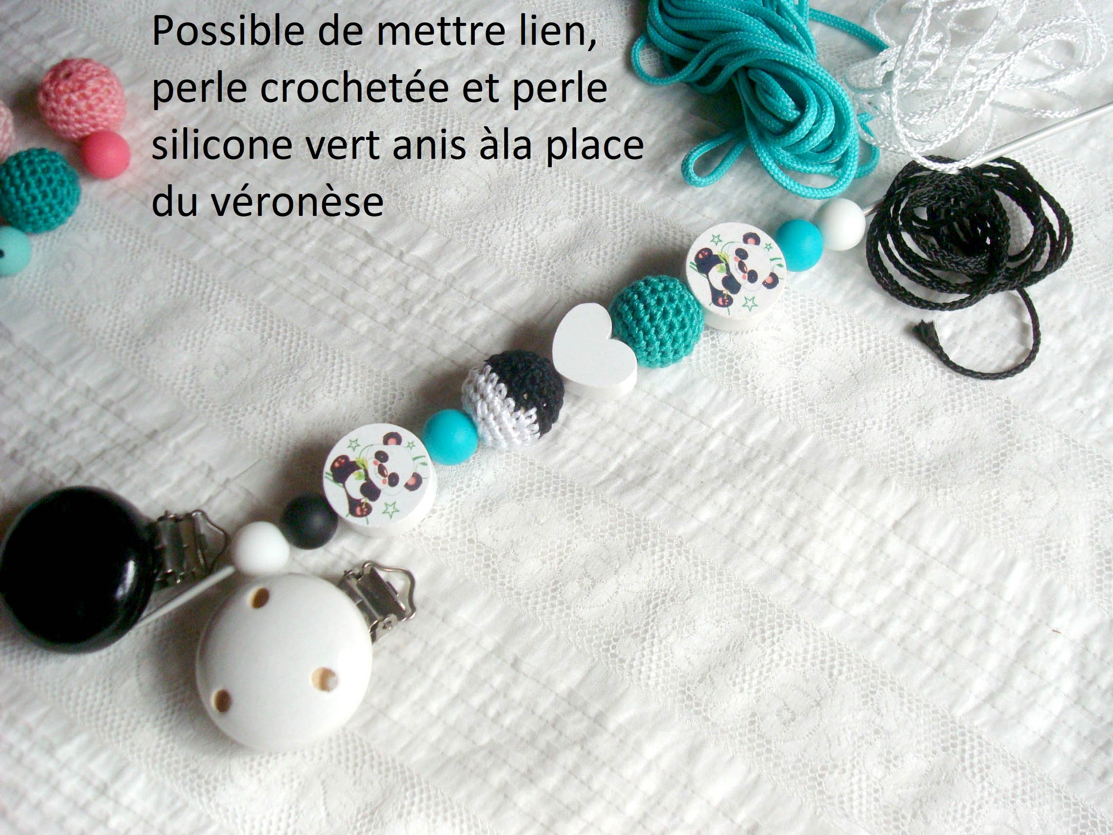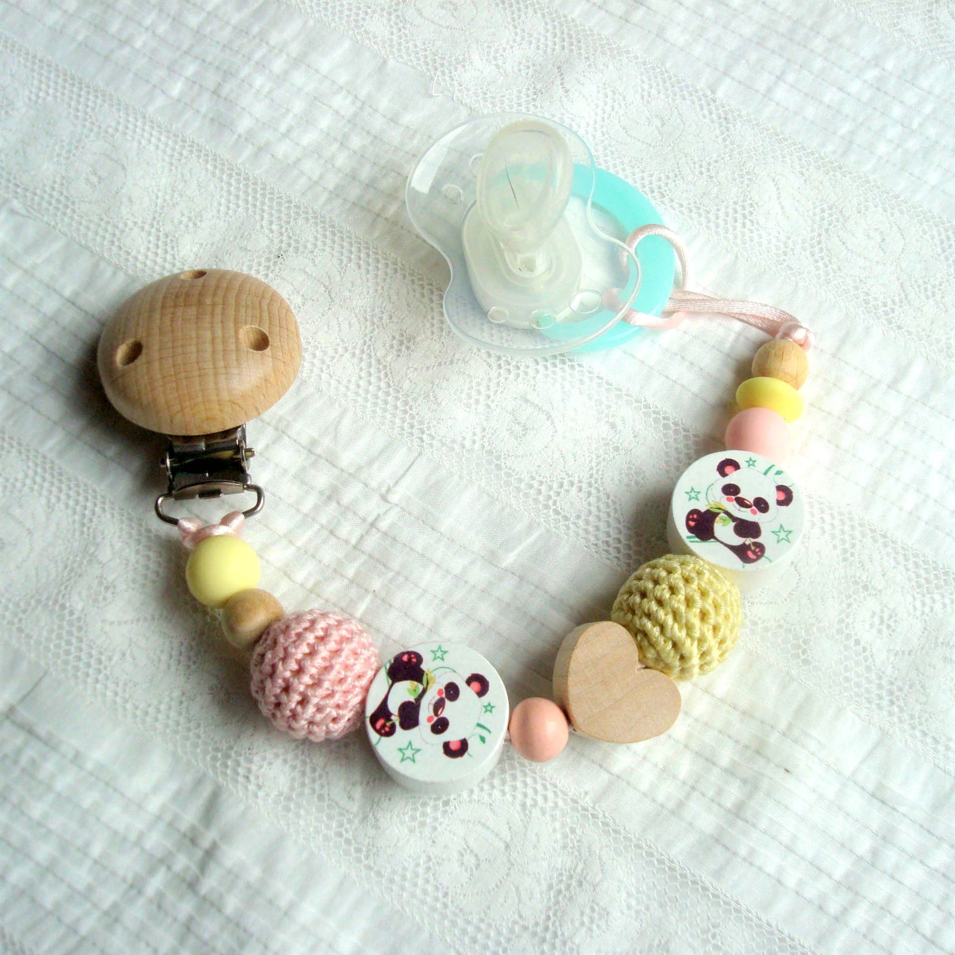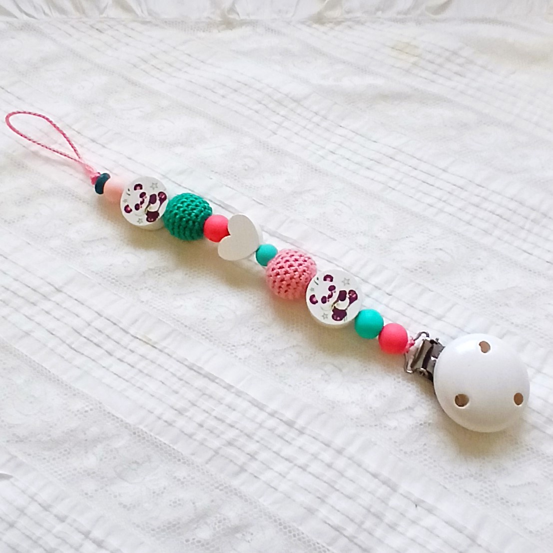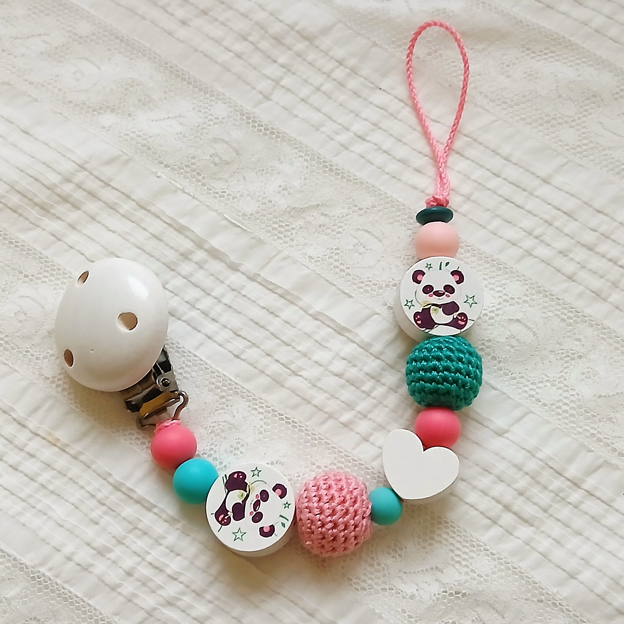 Elle est composée de deux adorables petites perles "Panda", d'un clip en bois blanc, d'une perle cœur en bois blanc, de perles en silicone rose et vert et de perles en coton crocheté assorties.