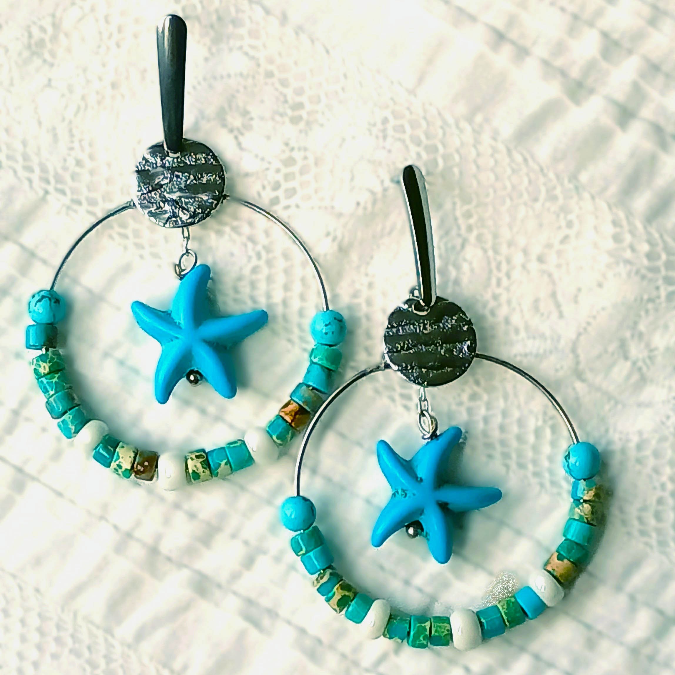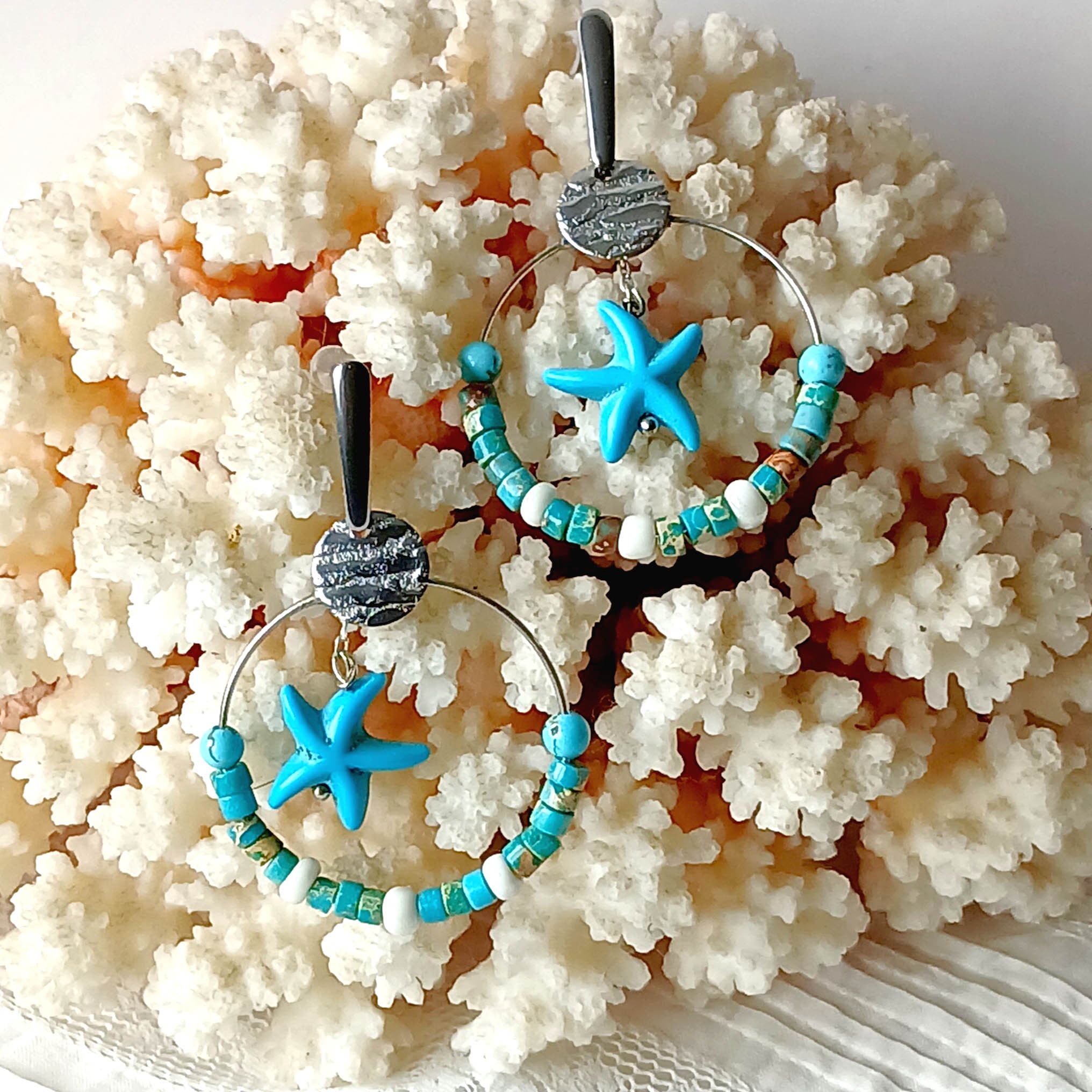 Elles sont montées sur un joli clou long en acier inoxydable avec bouchon poussoir en silicone. J'ai ajouté un sequin en acier inoxydable martelé