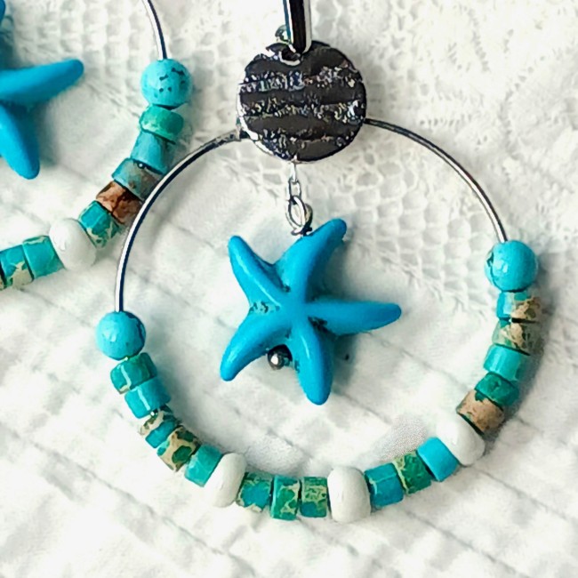 Elles sont composées, d'une alternance de perles Heishi en jaspe impérial et de rocailles ivoire. Deux perles en Howlite bleu turquoise viennent compléter l'ensemble.
