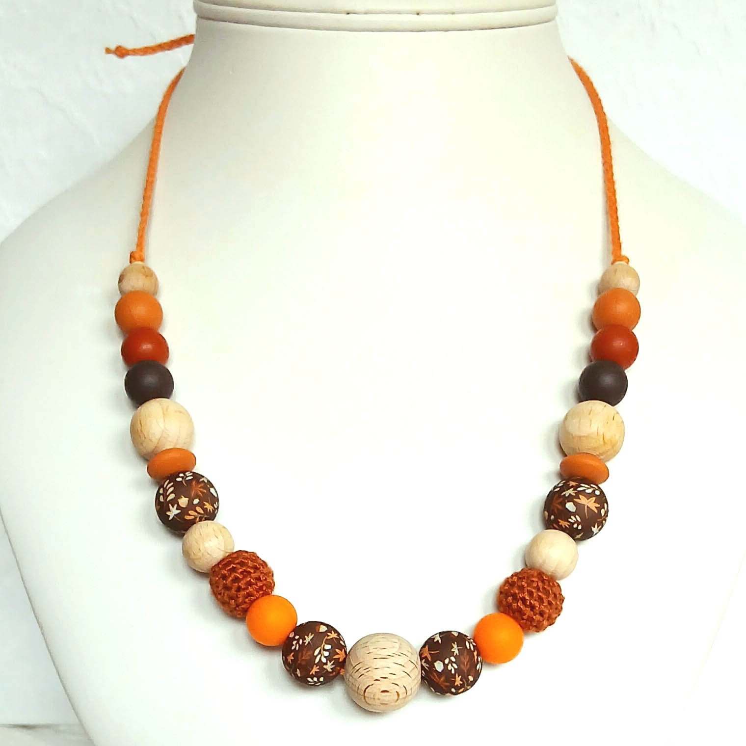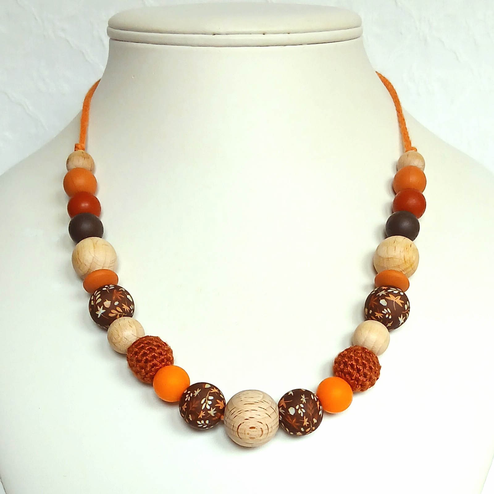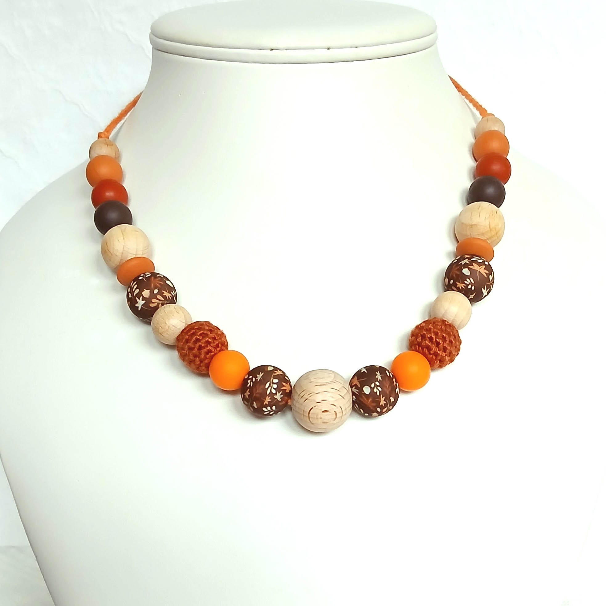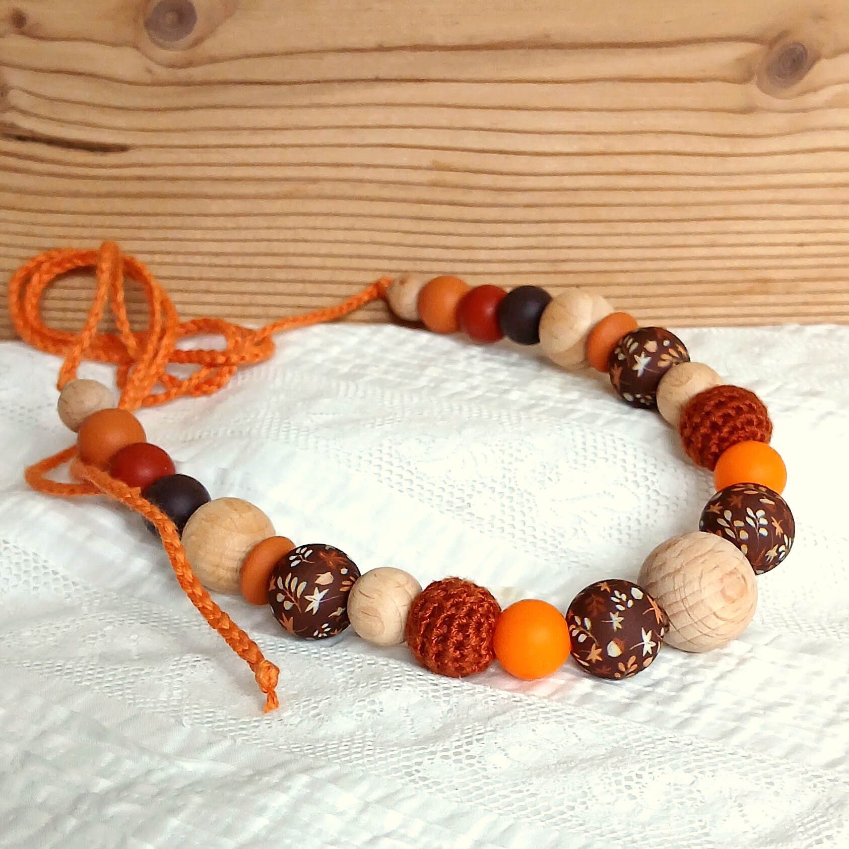 Les couleurs présentées sont : café, argile, ocre,mangue foncée, orange pour les perles silicone. Marron rouille pour les perles crochetées.