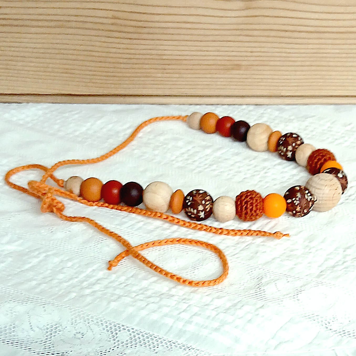 Les perles crochetées font environ 14 mm de diamètre, celles en hêtre 4,10, 12, 15,5 et 18,5 mm environ, celles en silicone 12 et 15 mm. Elles sont montées sur une cordelière de coton crocheté orange qui allie douceur et élasticité.