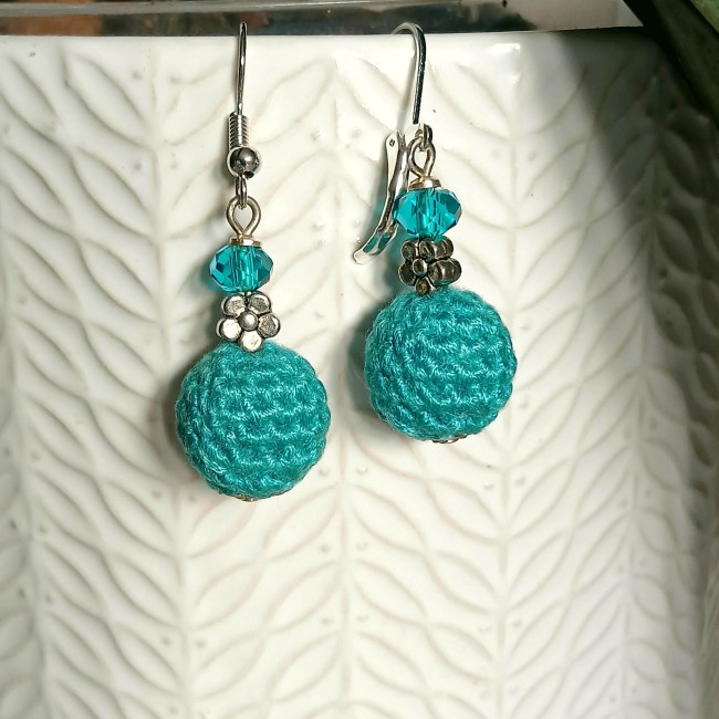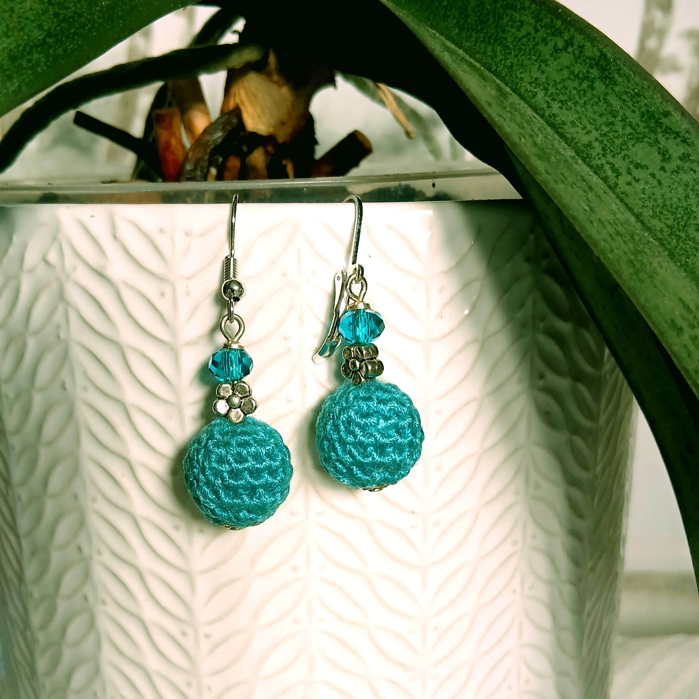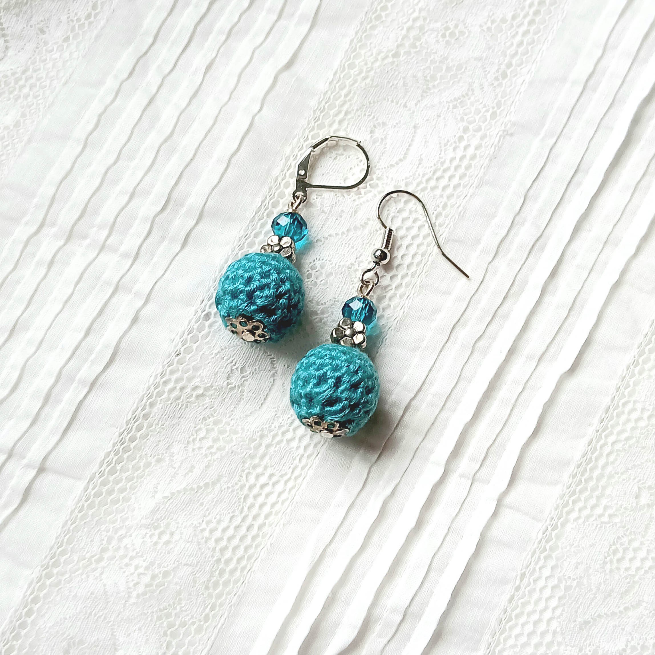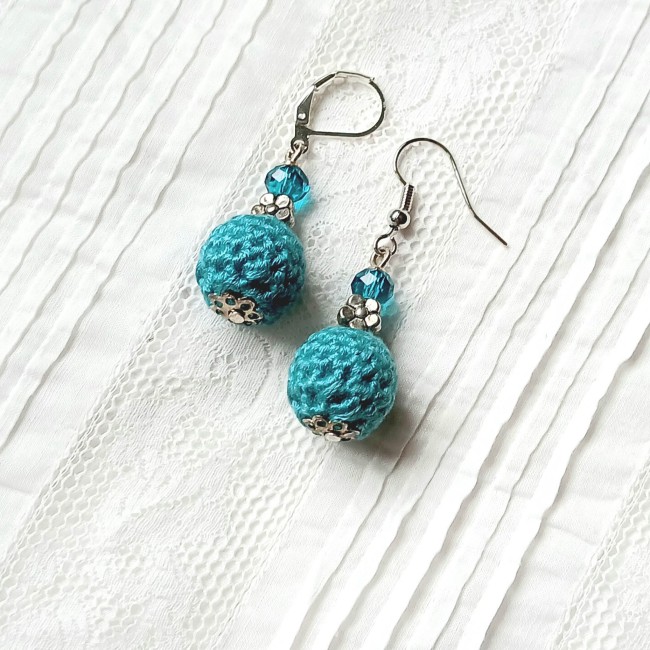 Il est réalisé avec une perle de coton crochetée par mes soins de 14 mm de diamètre et une citrouille facettée en cristal bleu canard de 6 x 4 mm .