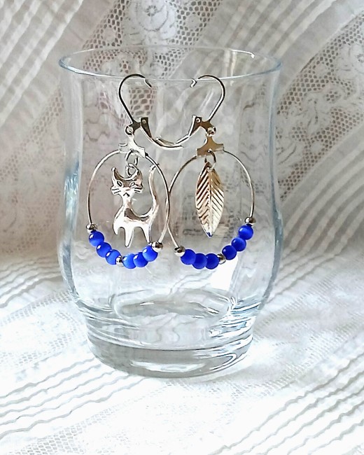 Créoles avec estampe libellule bleu marine et perles de verre.